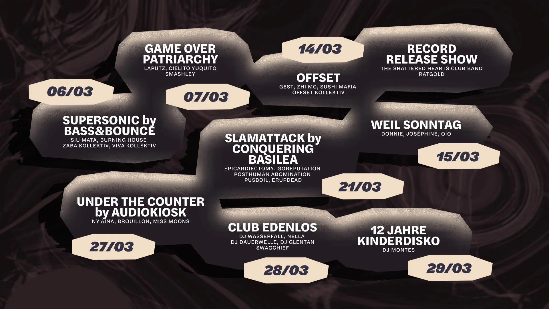 *** 06/03 | SUPERSONIC by BASS & BOUNCE *** 07/03 | GAME OVER PATRIARCHY! *** 14/03 | ALBUM RELEASE - THE SHATTERED HEARTS CLUB BAND *** 14/03 | OFFSET w/ GEST & ZHI MC *** 15/03 | WEIL SONNTAG *** 21/03 | SLAM ATTACK VOL. 1 *** 27/03 | UNDER THE COUNTER by AUDIOKIOSK *** 28/03 | EDENLOS *** 29/03 | 12 JAHRE KINDERDISKO