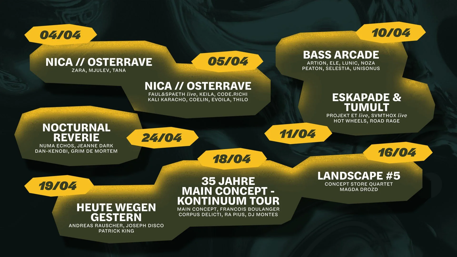 *** 27/03 | UNDER THE COUNTER by AUDIOKIOSK *** 28/03 | CLUB EDENLOS *** 29/03 | 12 JAHRE KINDERDISKO *** 04/04 + 05/04 | NICA // OSTER RAVE *** 10/04 | BASS ARCADE w/ Sturzflug Audio *** 11/04 | PROJEKT ET - Eskapaden & Tumult *** 16/04 | LANDSCAPE #5 *** 18/04 | MAIN CONCEPT - KONTINUUM TOUR *** 18/04 | DISCO2000 // HIP HOP & RNB SPECIAL *** 24/04 | NOCTURNAL REVERIE